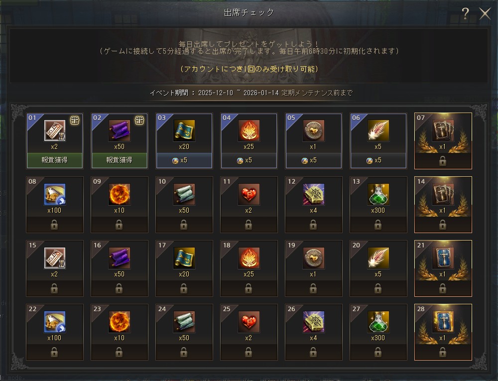 ログイン後5分経過すると、アイテムが受取可能になります。