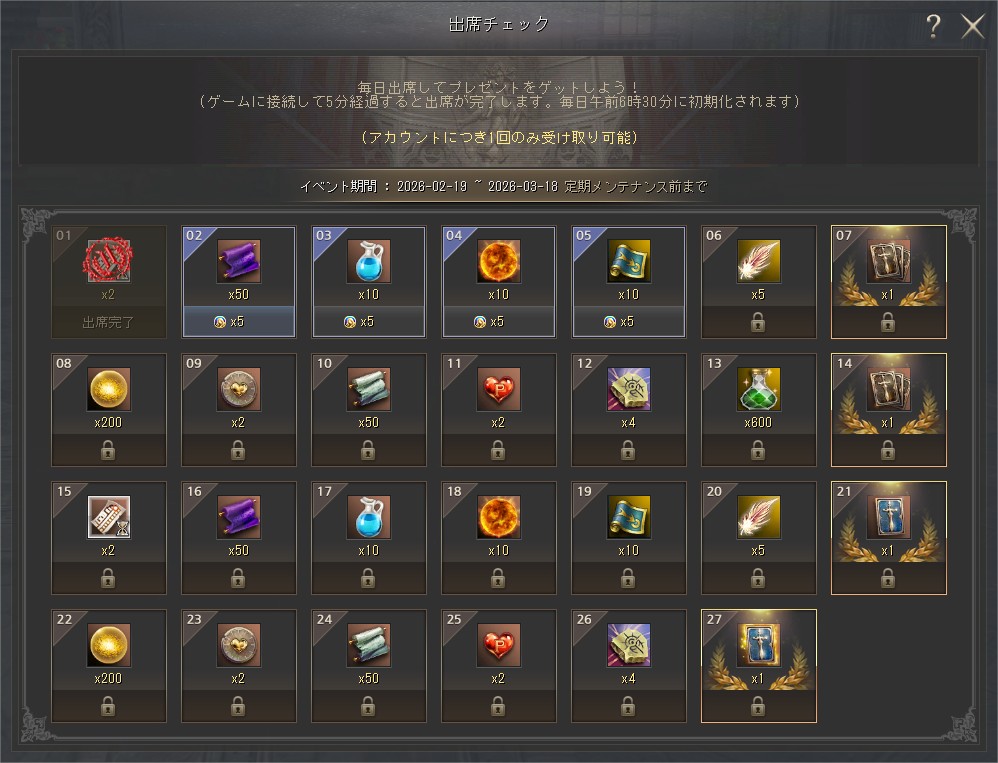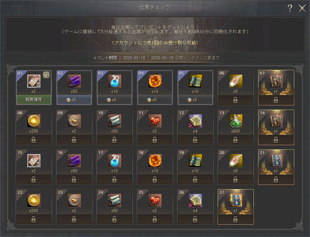 毎日 5分ログインするだけで、出席チェックのプレゼントがもらえちゃう!