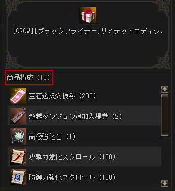 ※「商品/プレゼントインベントリ」の仕様により、パッケージ内のアイテム数が10種類を超える場合でも「商品構成(10)」と表示されます。