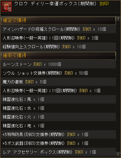 | クロウ デイリー幸運ボックス(期間制)(刻印) ※製作費用 ・白翡翠のクロウ コイン(期間制)(刻印) 10個 ・アデナ 5,000個 ※1アカウントにつき1日1回まで |