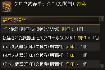 | クロウ武器ボックス(期間制)(刻印) ※製作費用 ・白翡翠のクロウ コイン(期間制)(刻印) 100個 ・アデナ 200,000個 |