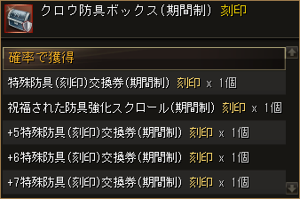 | クロウ防具ボックス(期間制)(刻印) ※製作費用 ・白翡翠のクロウ コイン(期間制)(刻印) 100個 ・アデナ 200,000個 |